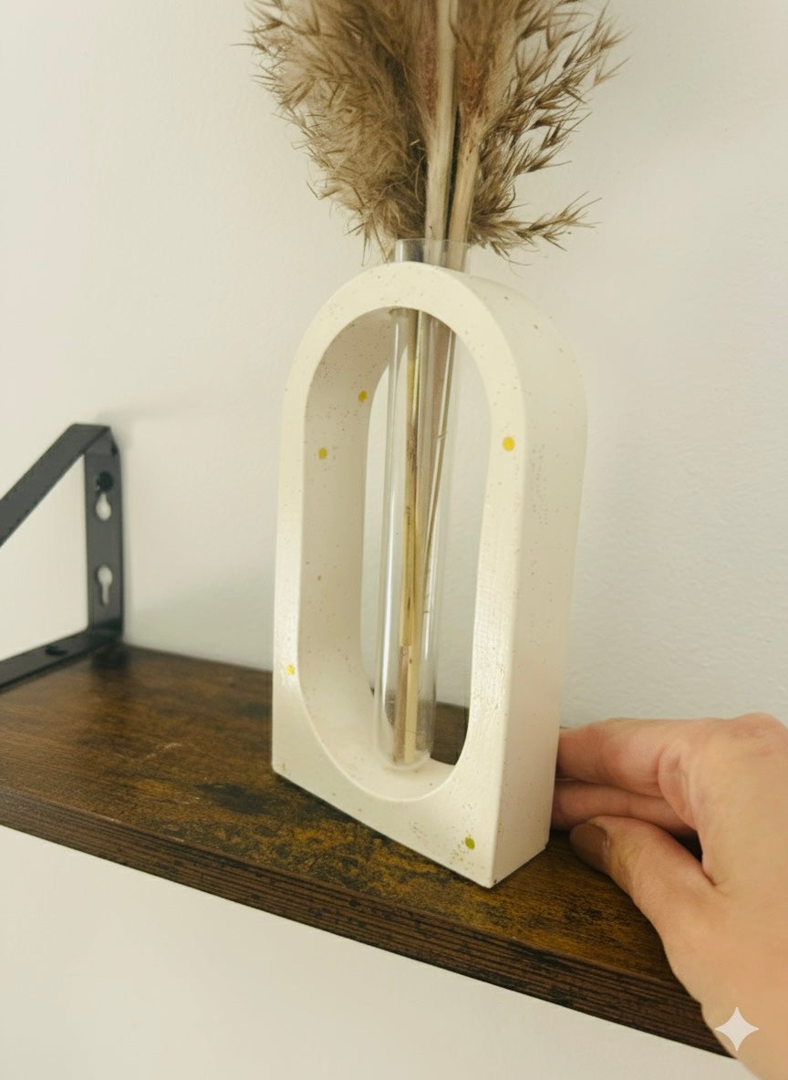 Ce charmant vase soliflore est fait main en plâtre céramique. Son design minimaliste en arche encadre parfaitement le tube à essai et ce jolie bouquet de fleurs séchées. Quelques paillettes dorées pour donner un peu de peps.